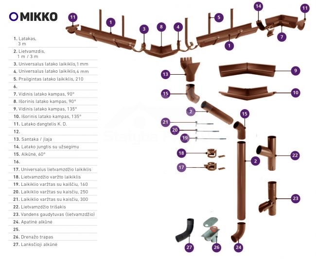 „MIKKO“ lietaus nuvedimo sistema - protingas patvarumo ir estetiškumo kompromisas. Ši sistema pagaminta iš aukštos kokybės abiejose pusėse dažytos, skardos PUR COAT, kurią tiekia Slovakijos plieno koncernas „U.S. Steel“. Šios sistemos elementai lengvai montuojami, bei pasižymi savo puikia išvaizda. Visiems „MIKKO“ sistemos elementams suteikiama 30 metų garantija. Patikiname, kad sistema bus atspari korozijai, o dažytas paviršius, matomoje pusėje ilgus metus išsaugos estetines savybes.