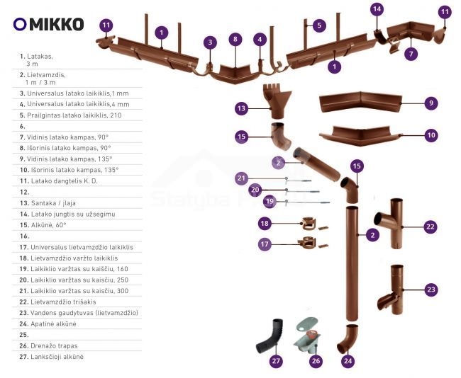 „MIKKO“ lietaus nuvedimo sistema - protingas patvarumo ir estetiškumo kompromisas. Ši sistema pagaminta iš aukštos kokybės abiejose pusėse dažytos skardos PUR COAT, kurią tiekia Slovakijos plieno koncernas „U.S. Steel“. Šios sistemos elementai lengvai montuojami bei pasižymi savo puikia išvaizda. Visiems „MIKKO“ sistemos elementams suteikiama 30 metų garantija. Patikiname, kad sistema bus atspari korozijai, o dažytas paviršius, matomoje pusėje ilgus metus išsaugos estetines savybes.