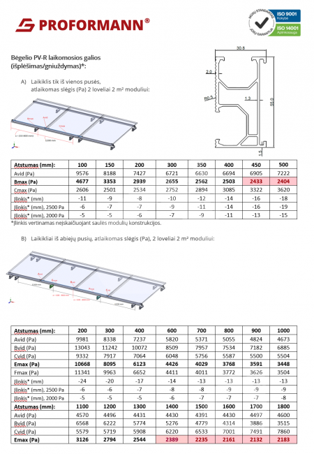 Patentuotos saulės modulių konstrukcijos „Proformann“ bėgelis PV-R sukonstruotas taip, kad visi jį sudarantys elementai išsidėstytų tinkamai ir netrukdytų vienas kitam. Bėgelis lengvai montuojamas ant fiksatorių. Bėgelio konstrukcija sukurta taip, kad apkrovos pasiskirstytų tolygiai, o storos ir aukštos (net 55 mm aukščio) konstrukcinės sienelės leistų bėgeliui atlaikyti ypač dideles apkrovas. Šis bėgelis puikiai tinka visuose Lietuvos vėjo ir sniego apkrovos rajonuose.
