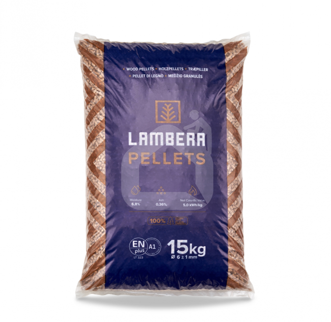 Sertifikuotos ENplus A1, 6 mm medžio granulės, premium kokybės. Parduodama paletėmis. Standartinė paletė – 70 vnt. maišų, neto svoris – 1050 kg.