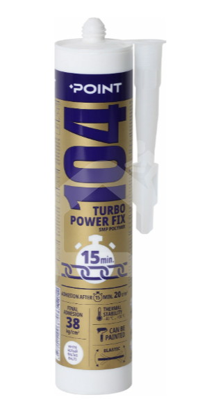 POINT 104 TURBO POWER FIX tai ypatingai greitai kietėjantys ir ekstremalia sukibimo jėga pasižymintys hibridiniai klijai SMP polimero pagrindu skirti klijuoti daugumą statybinių medžiagų, įskaitant vertikalių labai sunkių elementų klijavimą. Tokių kaip keramikinės plytelės, plytos ar akmenys. Labai aukštą sukibimo jėgą (20 t/m2) pasiekia jau po 15 min. Sukibimo jėga po pilno sukietėjimo 380 t/m2 . Klijai puikiai sukimba su daugeliu statybinių medžiagų bei apdailos elementų, įskaitant, metalą, aliuminį, stiklą, PVC, poliuretaną, betoną ir kt. Tinka stogo čerpėms, grindjuostėms, įvairioms plokštėms, dailylentėms ir gipso kartono profiliams klijuoti. Galima naudoti vidaus ir lauko darbams. Klijų siūlę galima dažyti. Sudėtyje nėra skiediklių, todėl jie nėra agresyvūs jokiems paviršiams.