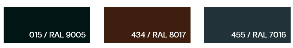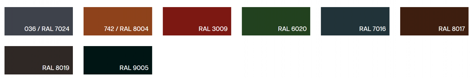 0,50 mm Ultra Matt (Z275 + 35µ): RAL7024 (grafitinė), RAL8004 (plytinė), RAL3009 (raudonų plytų), RAL6020 (tamsi žalia), RAL7016 (tamsi grafitinė), RAL8017 (ruda), RAL8019 (tamsi ruda), RAL9005 (juoda).