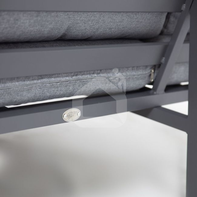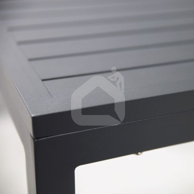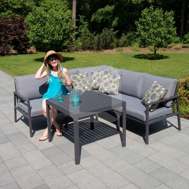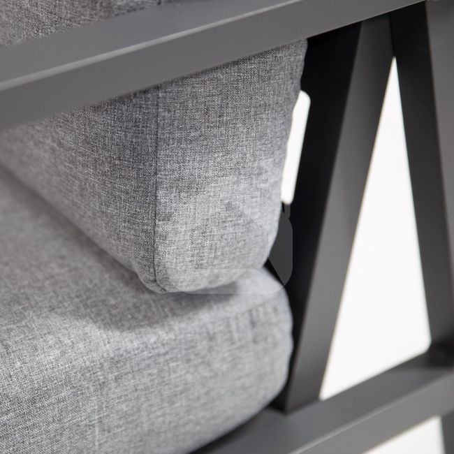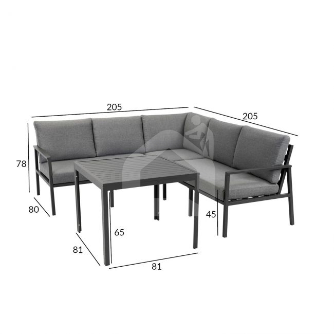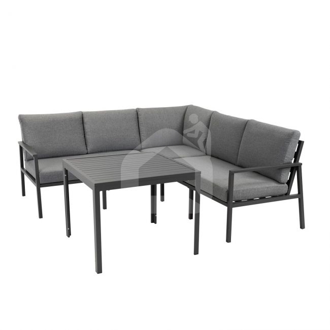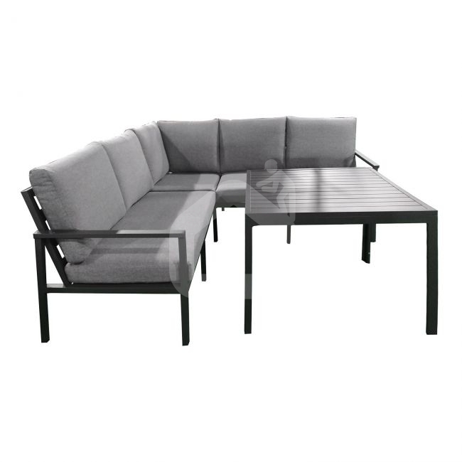 Tvirta pagrindinė visų komplekto dalių konstrukcija pagaminta iš aliuminio ir padengta juoda milteline danga. Stalo stalviršis ir kėdės bei sofos porankių skersiniai pagaminti iš tikmedžio išvaizdos polimedžio. Storos pilkos spalvos pagalvėlės užtikrina puikų sėdėjimo komfortą. Pagalvių užvalkalai pagaminti iš oro sąlygoms atsparaus olefino audinio. Gaminys yra patvarus kintančiomis oro sąlygomis ir lengvai prižiūrimas, nuo oro sąlygų reikia apsaugoti pagalvėles. Norint prailginti lauko baldų tarnavimo laiką, rekomenduojame naudoti lauko baldų užvalkalus.