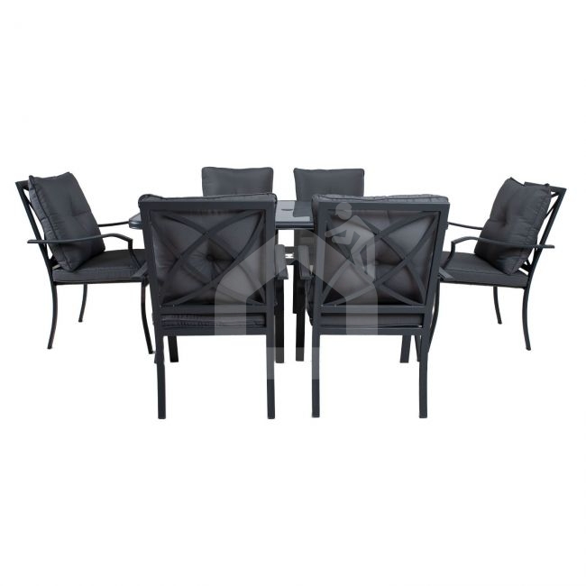 Visų komplekto dalių rėmai pagaminti iš plieno ir padengti pilka milteline danga. Sėdynės pagrindas aptrauktas pilku tekstileniniu audiniu, kuris gerai vėdinasi, greitai džiūsta ir yra lengvai valomas. Minkštos sėdynės pagalvėlės aptrauktos pilku poliesterio audiniu. Kėdės gali būti sukraunamos viena ant kitos. Gaminys yra patvarus kintančiomis oro sąlygomis ir lengvai prižiūrimas, nuo oro sąlygų reikia apsaugoti pagalvėles. Norint prailginti lauko baldų tarnavimo laiką, rekomenduojame naudoti lauko baldų užvalkalus.