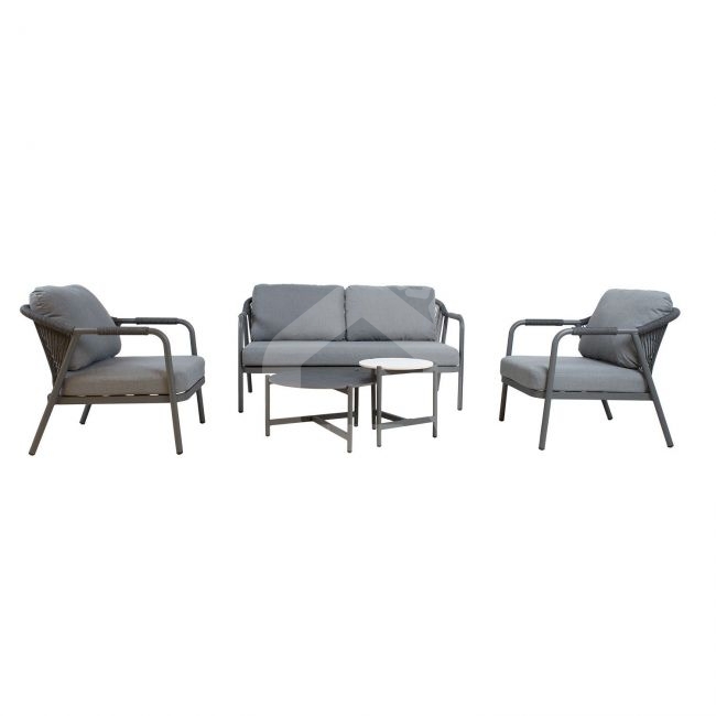 Pagrindinė visų rinkinio dalių konstrukcija pagaminta iš aliuminio ir padengta pilka milteline danga. Sofos ir kėdžių atlošai ir porankiai padengti akį traukiančiu virvių pynimu, kuris pasižymi puikiu atsparumu atmosferos poveikiui. Į komplektą įtrauktos minkštos pagalvėlės. Stalų matmenys: D60xH34 cm ir D40xH42 cm. Stalų stalviršiai pagaminti iš sukepinto akmens. Didesniojo stalo plytelė yra pilkos spalvos, o mažesniojo stalo plytelė - baltos spalvos. Sofos matmenys 148x81x73,5 cm, kėdės matmenys 69x81xH3,5 cm. Sėdynių pagrindai paremti aliuminio skersiniais. Pagalvėlių užvalkalai pagaminti iš poliesterio audinio. Sėdynės pagalvėlės storis - 10 cm.