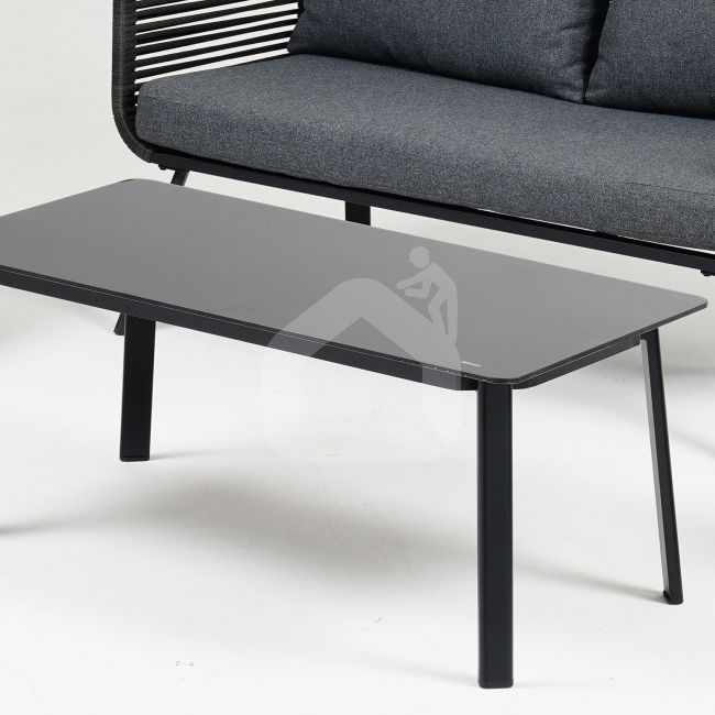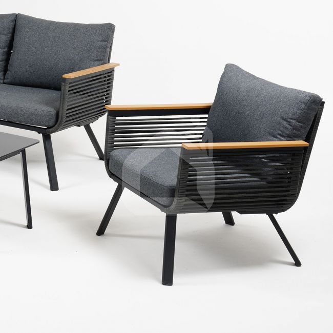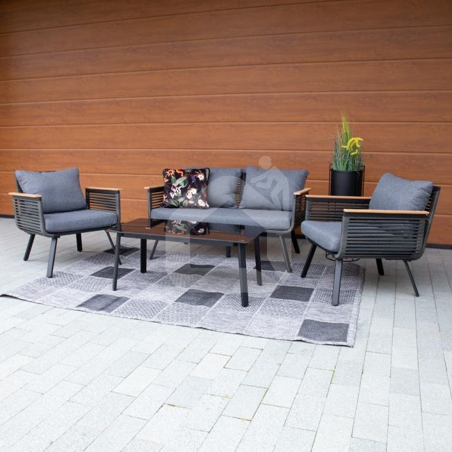 Visų rinkinio dalių rėmai ir kojos pagaminti iš aliuminio ir padengti juoda milteline danga. Sofos ir kėdžių sėdimųjų dalių šonai ir atlošai aptraukti juodu plastikiniu pynimu. Porankiai turi tikmedžio spalvos dirbtinio medžio skersinius. Į komplektą įeina pagalvėlės. Pagalvėlių užvalkalai pagaminti iš tamsiai pilko poliesterio audinio.