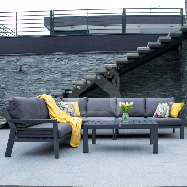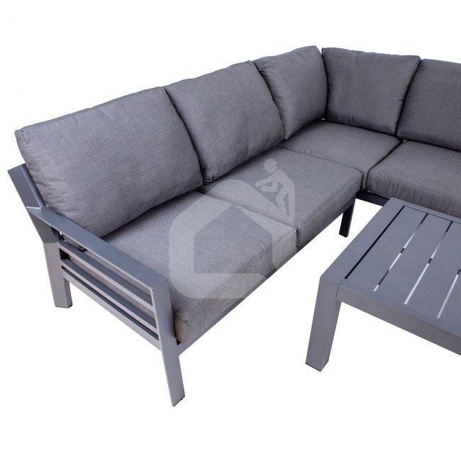 Sofa ir stalas pagaminti iš aliuminio ir padengti tamsiai pilka milteline danga. Kampinę sofą sudaro trys dalys: 2 vietų dalis su kairiuoju porankiu 142x85,5x71,5 cm, 2 vietų dalis su dešiniuoju porankiu 142x85,5x71,5 cm, 2 vietų kampinė dalis 151x85,5x71,5 cm. Stalo matmenys 116x70x45cm. Į komplektą įeina 6 sėdynių pagalvėlės ir 7 atlošo pagalvėlės. Pagalvėlių užvalkalai pagaminti iš pilko olefino audinio.