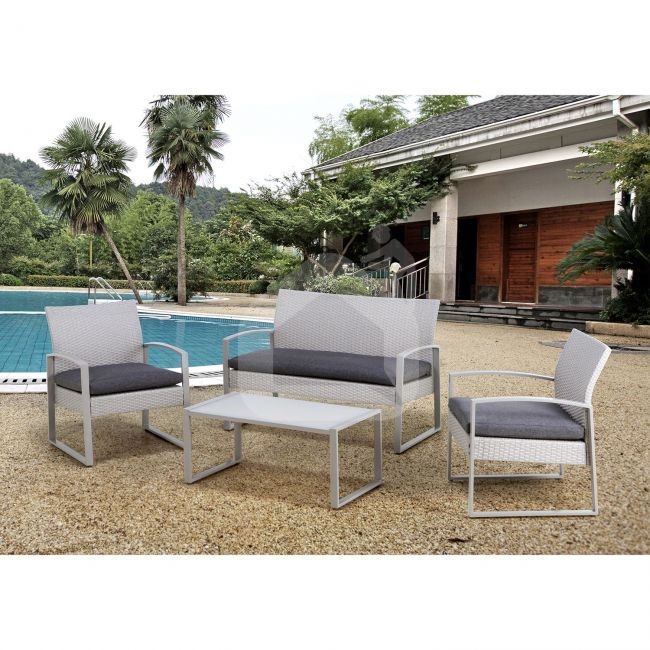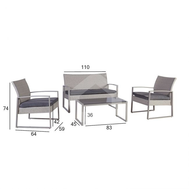 Visų komplekto dalių rėmai pagaminti iš plieno ir padengti pilka milteline danga. Kėdžių ir suolo sėdynės ir atlošai aptraukti pilkos spalvos plastikinėmis pintinėmis. Į komplektą įtrauktos sėdynių pagalvėlės. Pagalvėlių užvalkalai pagaminti iš pilko poliesterio audinio. Gaminys yra patvarus kintančiomis oro sąlygomis ir lengvai prižiūrimas, nuo oro sąlygų reikia apsaugoti pagalvėles. Norint prailginti lauko baldų tarnavimo laiką, rekomenduojame naudoti lauko baldų užvalkalus.