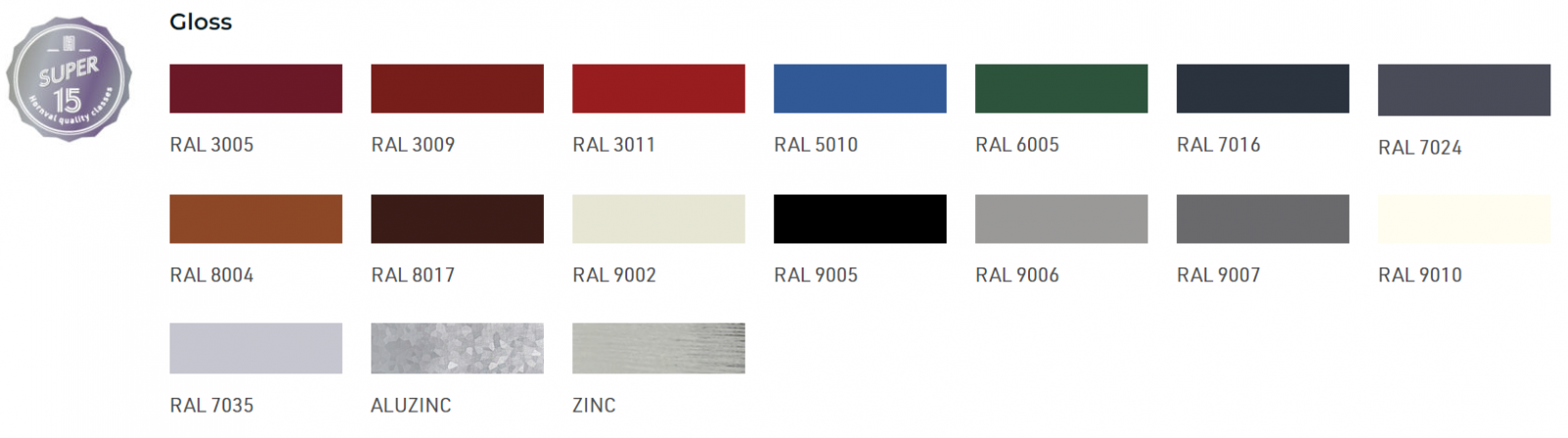 Spalvos: RAL3005 (raudono vyno), RAL3009 (raudonų plytų), RAL3011 (vyšninė), RAL5010 (mėlyna), RAL6005 (žolės žalia), RAL7024 (grafitinė), RAL7016 (tamsi grafitinė), RAL8004 (plytinė), RAL8017 (ruda), RAL9002 (dramblio kaulo), RAL9005 (juoda), RAL9006 (sidabrinė), RAL9007 (tamsi sidabrinė), RAL9010 (balta), RAL7035 (šviesi pilka)