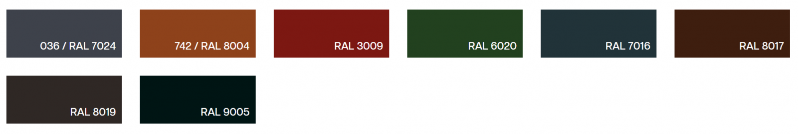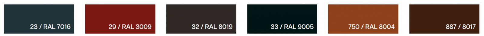 0,50 mm Ultra Matt (Z275 + 35µ): RAL7024 (grafitinė), RAL8004 (plytinė), RAL3009 (raudonų plytų), RAL6020 (tamsi žalia), RAL7016 (tamsi grafitinė), RAL8017 (ruda), RAL8019 (tamsi ruda), RAL9005 (juoda).