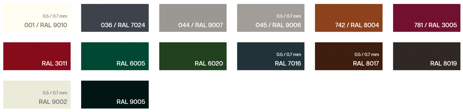 0,50mm Magnez Matt®(ZM275+35µ), Voestalpine (Austrija): RAL3009, RAL7024, RAL8004, RAL8017, RAL8019, RAL9005