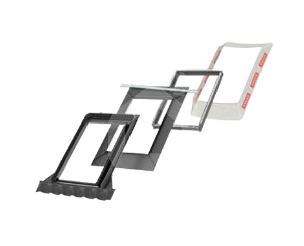 - BFX drėgmės izoliacinė medžiaga (klostuota difuzinė plėvelė, sandariai sujungianti langą su stogo plėvele) ir vandens nutekėjimo latakas (virš lango montuojamas elementas, užtikrinantis saugų vandens nuvedimą);