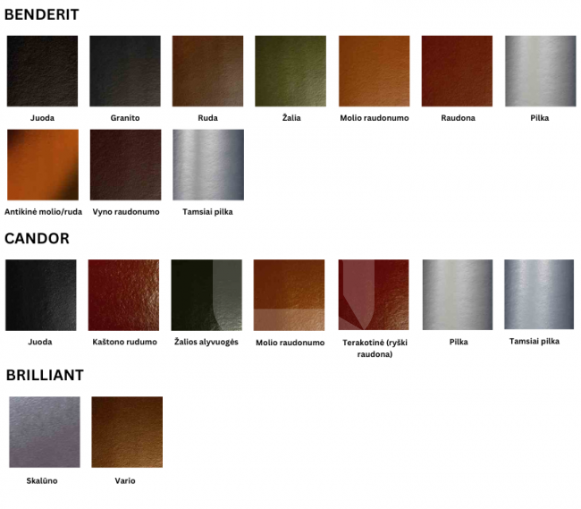 CANDOR. Benders Candor paviršius išsiskiria dideliu blizgumu, kuris suteikia daug privalumų. Šis dažų padengimo būdas suteikia didelį stiprumą ir tvirtumą, todėl čerpės paviršius išlieka estetiškas ilgą laiką. Taip pat šis dažų padengimas yra atsparesnis samanų ir kitų nepageidaujamų augalų atsiradimui. Šis paviršius yra gaminamas jau 26 metus, yra išdirbtas, todėl itin tinka reikliems klientams, kuriems svarbi nepriekaištinga kokybė.