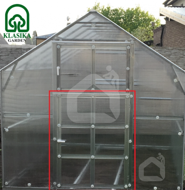 - Komplektuojant papildomas duris šiltnamiui KLASIKA HOUSE, šiltnamio pirkimo metu, rinktis dangos storio nereikia. Pasirinkite, jog papildomos durys šiltnamio gale būtų "BE DANGOS", nes papildomoms durims dangą išsipjausite iš polikarbonato lakštų pateiktų kartu su šiltnamiu.
