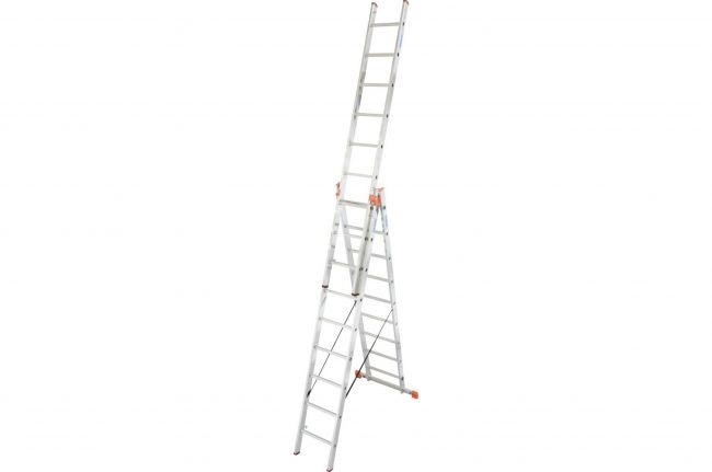 3 dalių po 9 pakopų, profesionalios TRIBILO aliuminės kopėčios, naudojamos kaip pasvirusios, prailginamos ir laisvai pastatomos kopėčios su ištraukiama kopėčių dalimi.