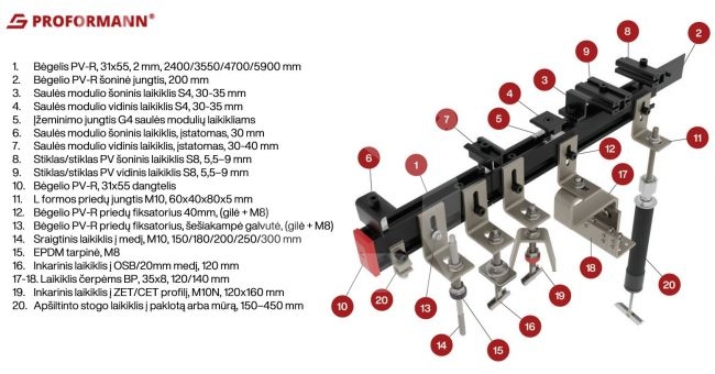 Naujo dizaino ir ypač dailios formos šoninis laikiklis stabiliai fiksuoja saulės modulį. Laikiklį sumontuoti ypač paprasta, nes jis jungiasi į bėgelį PV-R per įstatomą fiksatorių, kuris vėliau užrakinamas varžtu.