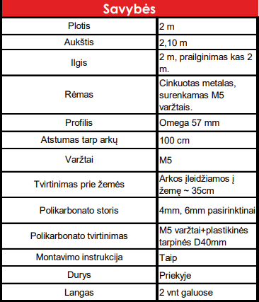 Komplektacijoje: karkasas, PC lakštai, visi reikalingi tvirtinimo elementai: varžtai, tarpinės, dviejų dalių durys priekyje, langas gale.