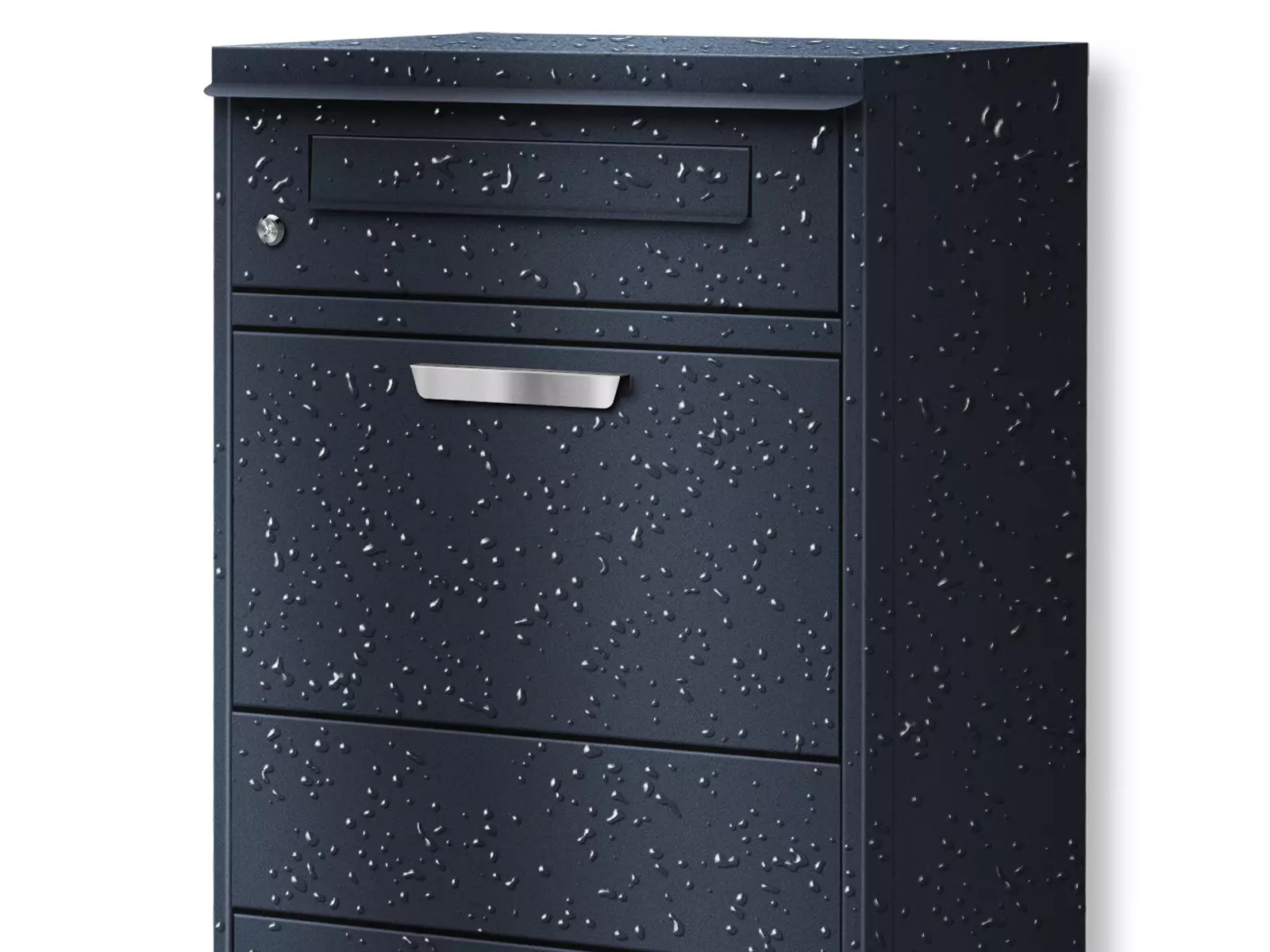 Be nepriekaištingos funkcijos, MIKKO dėžutė išsiskiria šiuolaikišku dizainu. Matinė antracito pilka spalva su nerūdijančio plieno graviravimo plokštėmis sukuria modernų įvaizdį. Papildomai, elegantiškas 3D efektas ant rankenų pabrėžia dėžutės išskirtinumą ir harmoningai dera su bet kokiu namų fasadu.