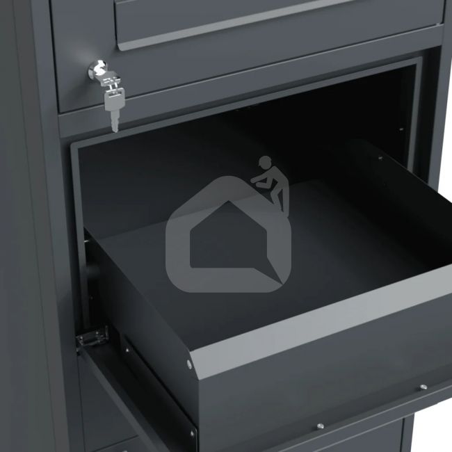 - Atskirų skyrių sistema: dėžutėje integruoti atskiri skyriai laiškams ir siuntoms. Tai leidžia palaikyti tvarką ir užtikrina patogų naudojimą, nes siuntos ir laiškai nesimaišo.
