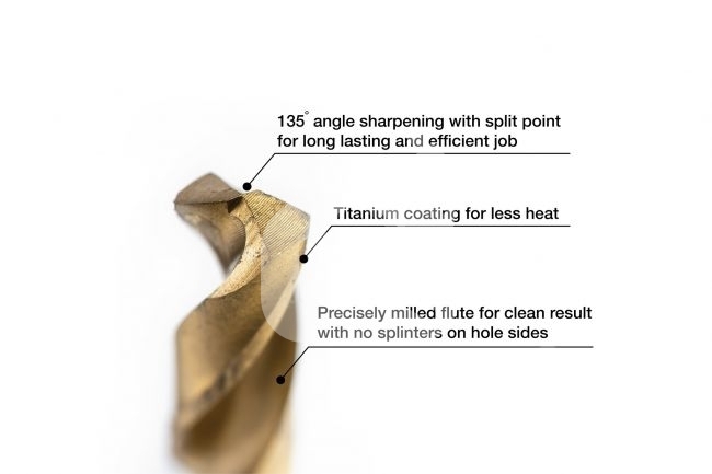- 135° kampo grąžto viršūnė – efektyvesnis kietesnių medžiagų gręžimas.