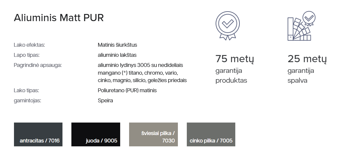 SVARBU! Atkreipiame dėmesį, jog parduodamų skirtingų plieno gaminių (čerpinių profilių, trapecinių profilių, skardos lankstinių ir kt.) atspalvis, nors ir pažymėtas tuo pačiu RAL kodu, gali kažkiek skirtis. Ypač jei gaminiai yra skirtingų gamintojų. Norint išvengti atspalvių skirtumų tarp gamybos partijų, darant užsakymą būtina įsivertinti visą reikiamą kiekį objektui užbaigti. Užsakant keliais etapais negalime garantuoti spalvos ir atspalvio testinumo. Jeigu norima prie seno užsakymo papildomai užsakyti naują gaminį, privaloma apie tai informuoti užsakymą priėmusį darbuotoją, kad būtų galima parinkti optimaliausią variantą.