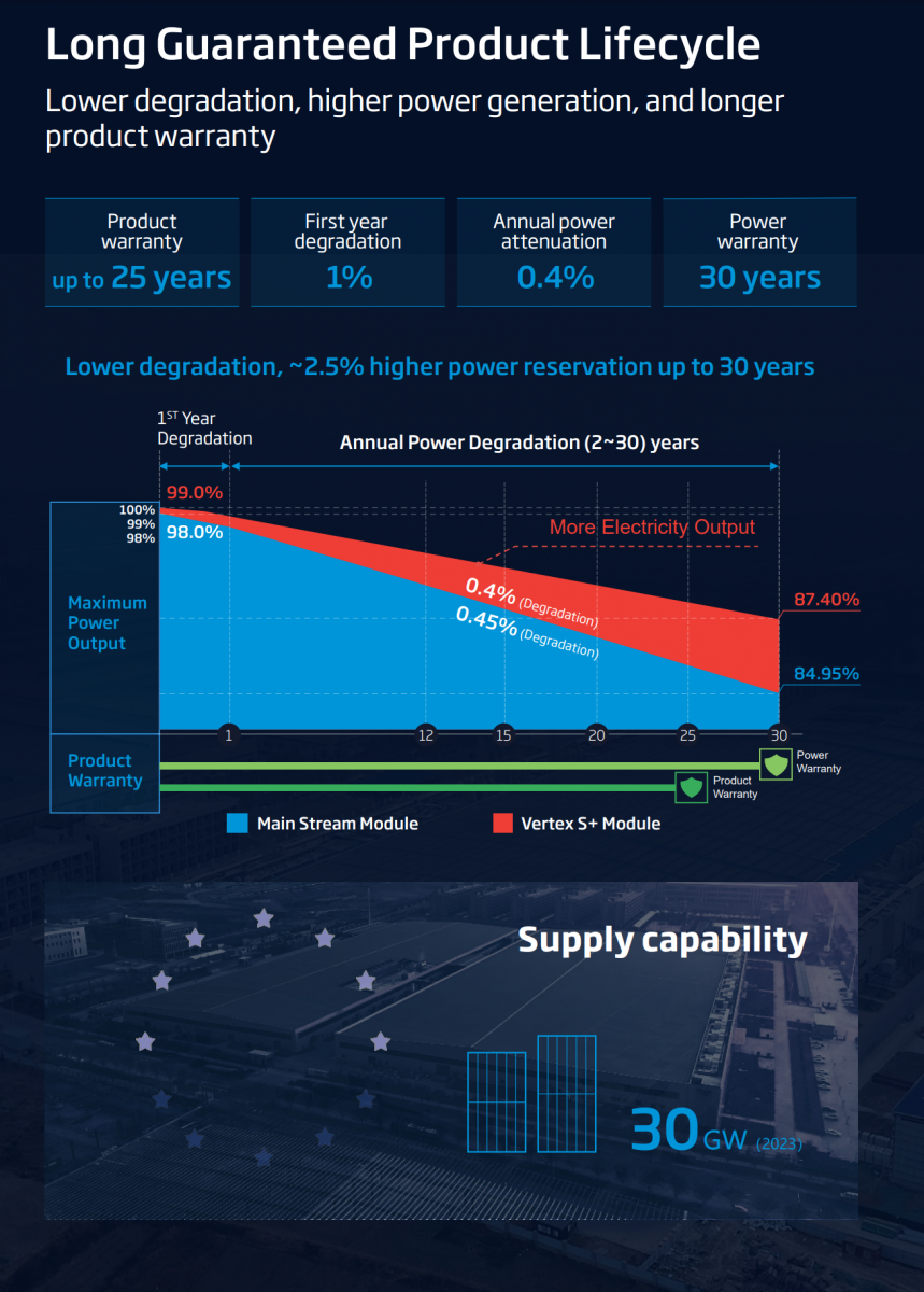 • Trina moduliai yra vieni iš populiariausių saulės modulių gamintojų pasaulyje. Vienas pagrindinių jų privalumų yra aukštos kokybės gamyba, kurią užtikrina griežtos gamybos kontrolės procedūros ir reguliarūs produktų testavimai. Trina moduliai pasižymi aukštu efektyvumo koeficientu, gali generuoti elektros srovę esant silpnesniam saulės šviesos intensyvumui ir žinomi dėl ilgos garantijos. Daugiau apie Trina modulius: „Trina saulės modulių apžvalga“.