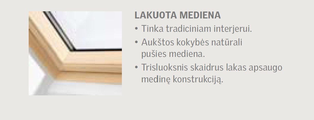 Pušies medienos stogo langas, nulakuotas skaidriu laku. Originalus, viršutine rankena varstomas langas turi integruotą vėdinimo sistemą, bei filtrą nuo dulkių ir vabzdžių. Šis modelis tinka įvariems montavimo aukščiams, po juo galima statyti baldus. Patogus uždaryti ir atidaryti viena ranka. Yra galimybė įrengti nuotolinio valdymo sistemą. Stoglangis su ThermoTechnology™ izoliacijos sistema, su sustiprintu vienos kameros stiklo paketu, jo Uw - 1,3. Varčią galima apversti 180°kampu, užfiksuoti specialiai tam įrengtais kaiščiais ir saugiai bei lengvai išvalyti išorinį lango stiklą, esant kambario viduje.