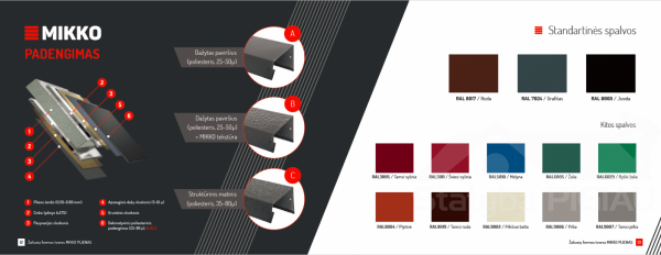 >Tvirta konstrukcija. Laikomieji šoniniai C profiliai lankstomi net iš 1 mm, o horizontalūs iš 0,50-0,60 mm plieno. Dėl aukštų šoninių kraštinių (51/81 mm) horizontalūs MIKKO profiliai atlaiko ypač aukštas slegiamąsias apkrovas.